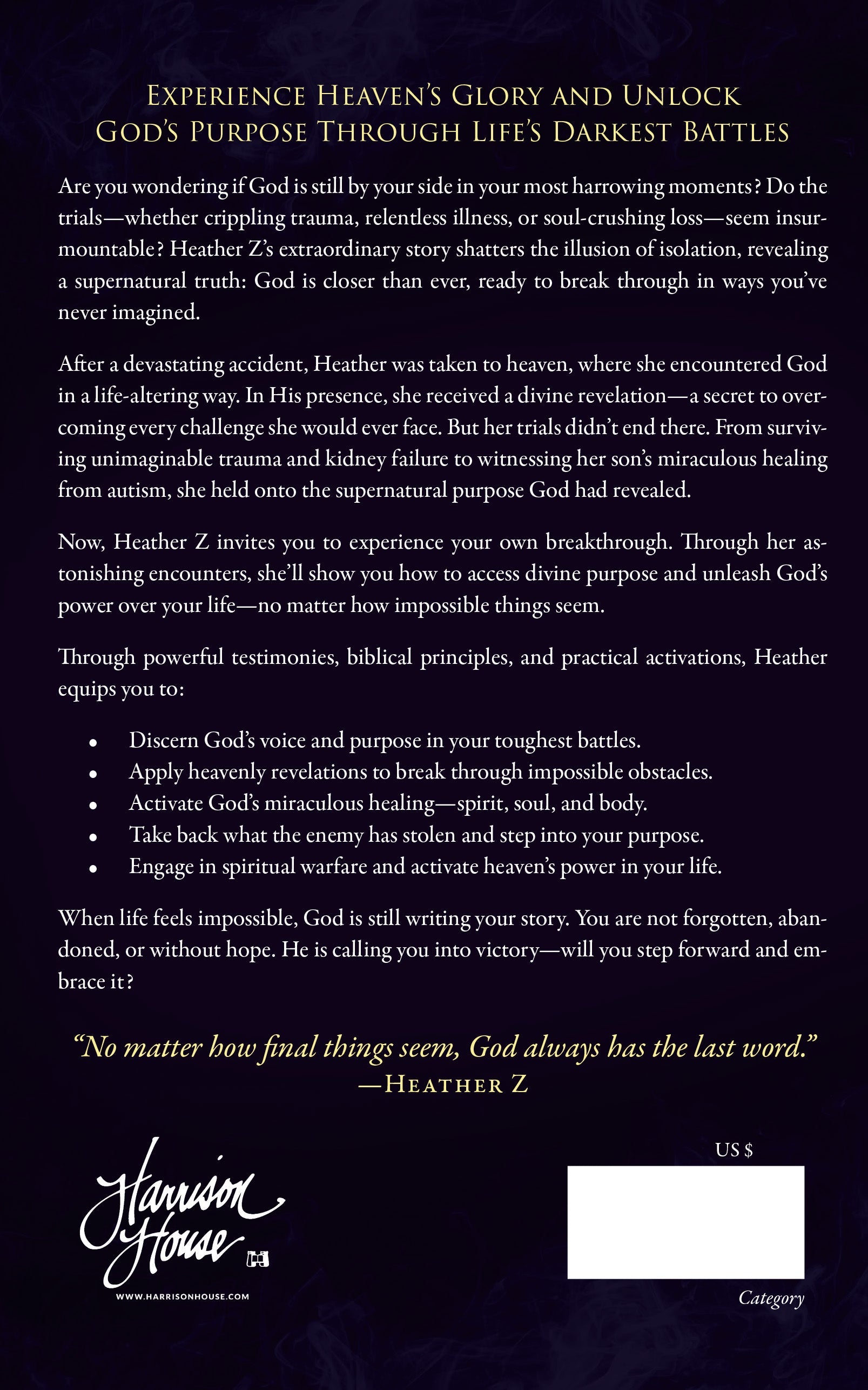 Having navigated these unimaginable trials, Heather Z invites you to unlock your supernatural breakthrough. Through her jaw-dropping encounters, she will show you how to access divine purpose and unleash God’s power over your life, no matter how impossible things may seem.